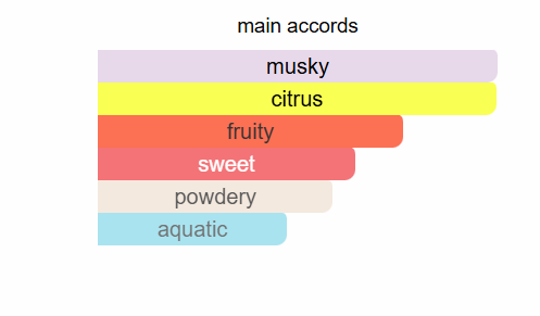 Een sprankelende, frisse opening vol zonnige citrusvruchten en sappige accenten. Het bloemige hart geeft een zachte, elegante draai, terwijl de musk-basis zorgt voor een warme, zachte en langdurige finish. Een geur die zomer en luxe ademt.